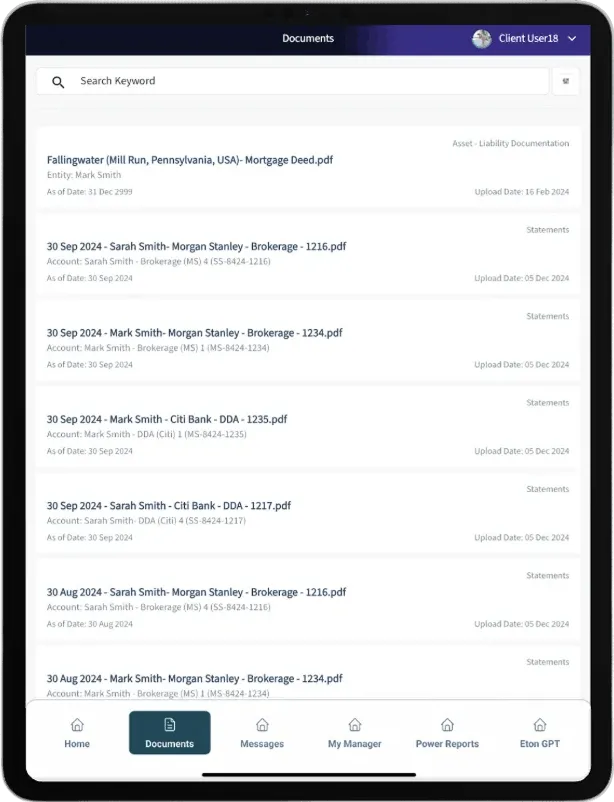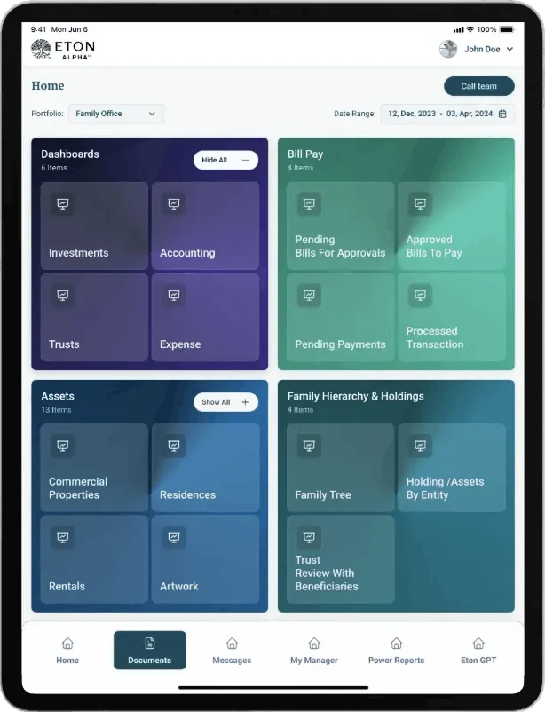 EtonAlpha™ provides a virtual, secure, and user-friendly wealth management experience - essentially putting a full family office in the palm of your hand.